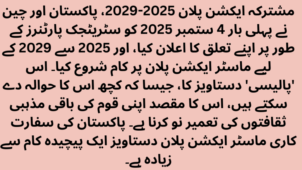Joint Action Plan 2025–2029, Pakistan and China proclaimed their connection as strategic partners for the first time on September 4, 2025, and began working on the Master Action Plan for the years 2025 to 2029. This ‘policy’ document, as some may refer to it, aims to reconstruct the very fabric of a nation its culture, rest on its religious pillars and external diplomacy of Pakistan. The Master Action Plan document is more than a complex piece of work.