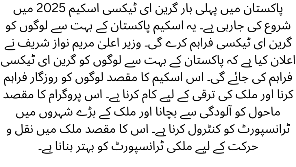 The Punjab Green E-Taxi Scheme 2025 is a government initiative launched by the Punjab Government under Chief Minister Maryam Nawaz Sharif to introduce 1,100 fully electric taxis on interest-free instalments. The programme aims to reduce pollution, modernise public transport, and create income opportunities for youth, women, and people with disabilities.