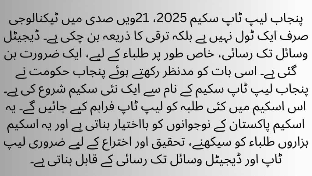 Punjab Laptop Scheme 2025, In the 21st century, technology is not just a tool but has become a means of progress. Access to digital resources, especially for students, has become a necessity. Keeping this in mind, the Punjab government has launched a new scheme called the Punjab Laptop Scheme. In this scheme, laptops will be provided to many students. This scheme empowers the youth of Pakistan and this scheme is enabling thousands of students to access laptops and digital resources necessary for learning, research and innovation.