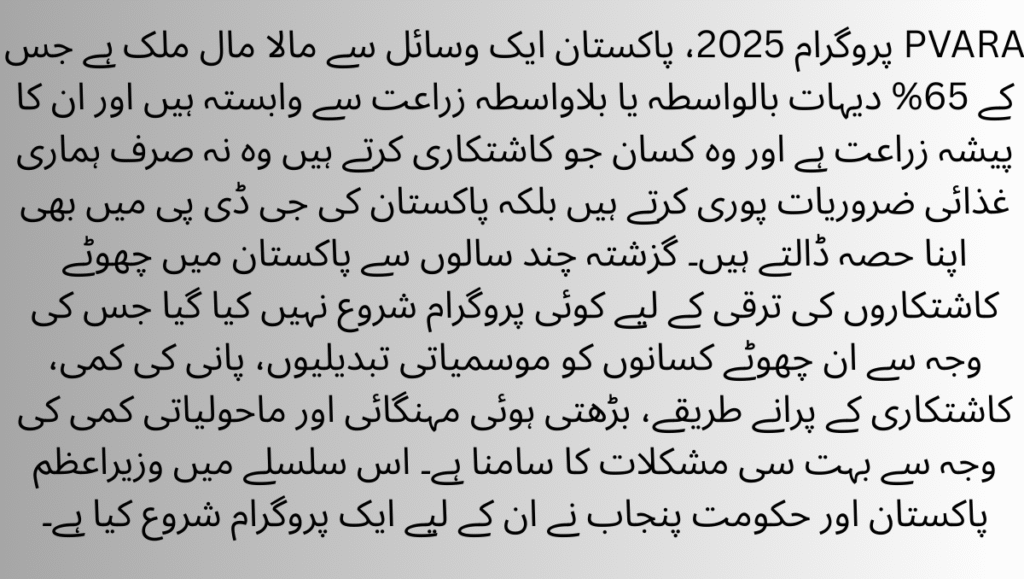 PVARA Program 2025, Pakistan is a resource-rich country with 65% of its villages directly or indirectly involved in agriculture and their profession is agriculture and the farmers who do farming not only meet our food needs but also contribute to Pakistan’s GDP. For the last few years, no program has been launched in Pakistan for the development of small farmers, due to which these small farmers are facing many difficulties due to climate change, water scarcity, old farming methods, increasing inflation and environmental shortages. In this regard, the Prime Minister of Pakistan and the Government of Punjab have launched a program for them.