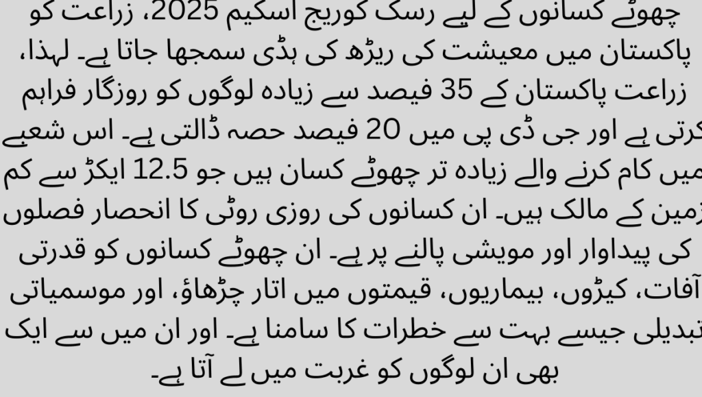 Risk Coverage Scheme for Small Farmers 2025,Agriculture is considered the backbone of the economy in Pakistan. Therefore, agriculture employs more than 35% of the people of Pakistan and contributes 20% to the GDP. Most of those working in this sector are small farmers who own less than 12.5 acres of land. The livelihood of these farmers depends on crop production and animal husbandry. These small farmers are exposed to many risks such as natural disasters, pests, diseases, price fluctuations, and climate change. And even one of them brings these people into poverty.